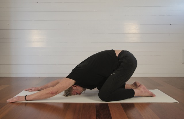 Flip onto your stomach then come up onto your knees and palms before pushing your hips back. Keep your knees apart and your feet together. Now breathe and enjoy.