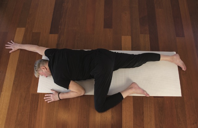 Flapping Fish is an excellent counterpose that stresses the shoulder blade of your extended arm, releasing any tension. It can help to reduce lower back pain and aid digestion.