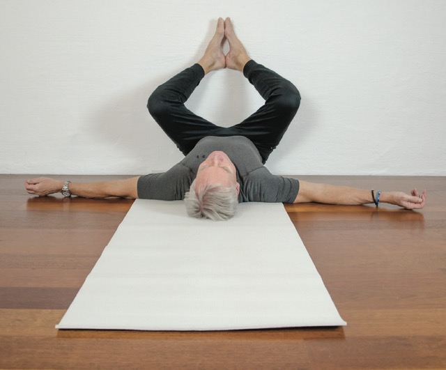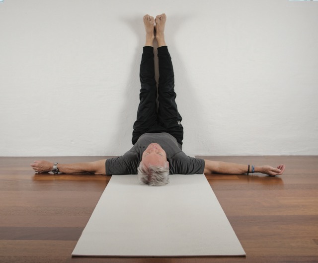 Enjoy relaxing by the wall. Having your legs in Butterfly, yet above your head while you control your breathing is a great way to slow your body and mind.